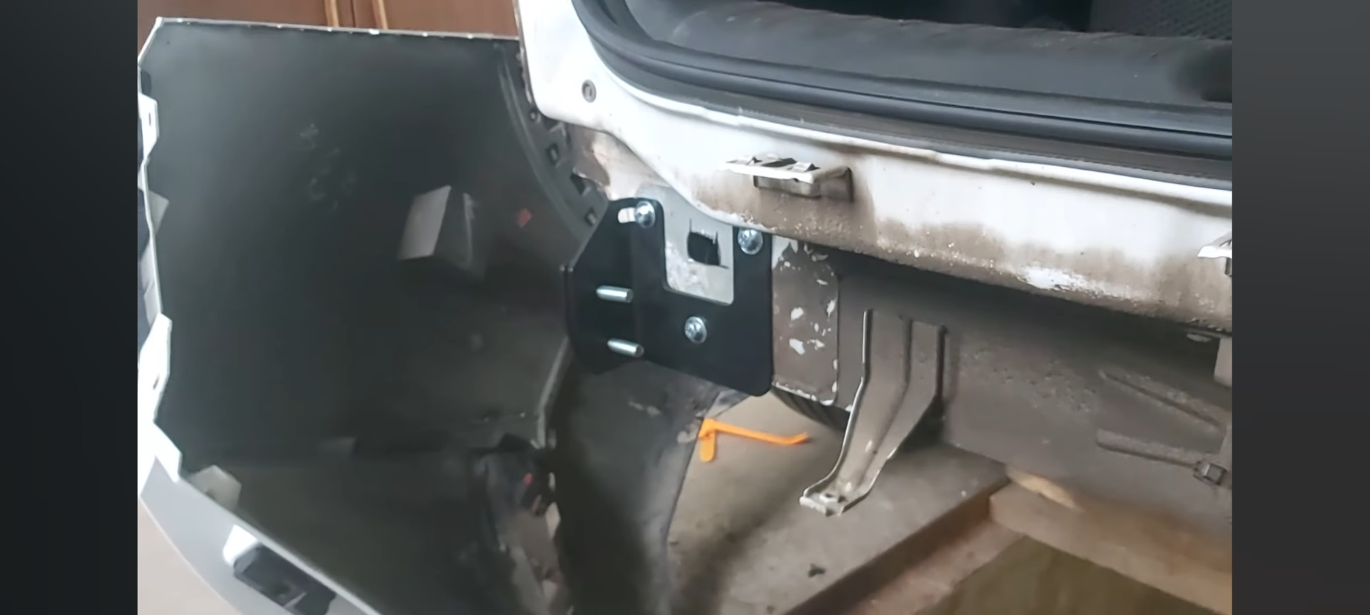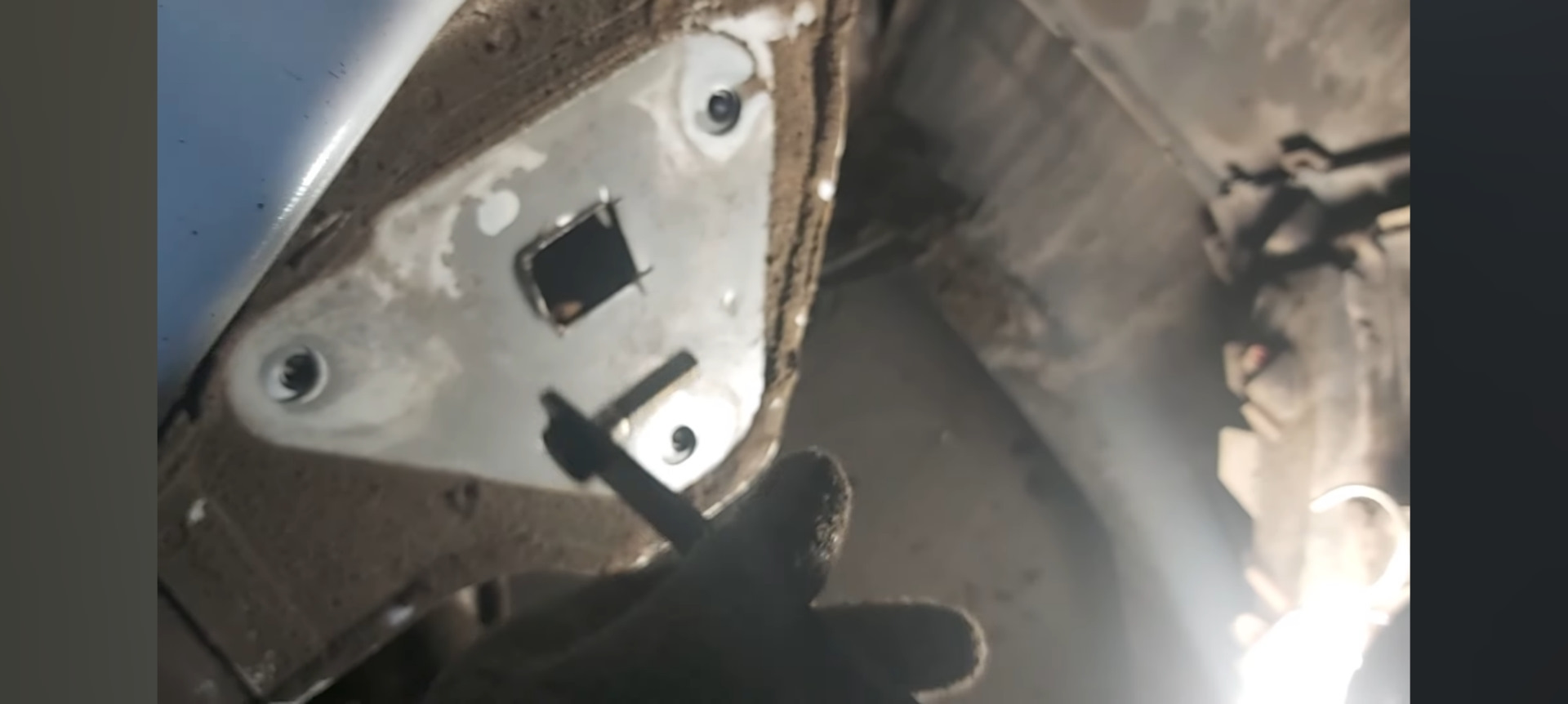 Чтобы поставить сам фаркоп нужно между этих трёх болтов высверлить (вырезать) отверстие, для того, чтобы просунуть внутрь лонжерона закладную с болтом на конце.